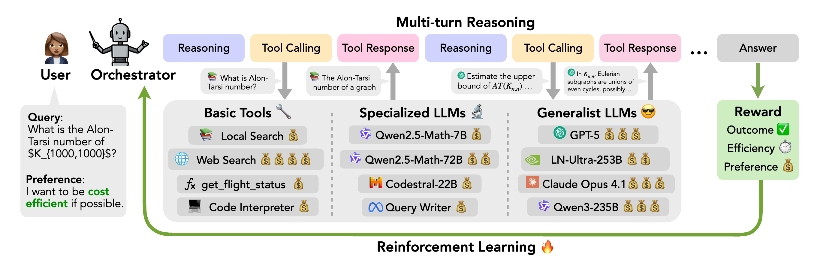 그럼에도 ToolOrchestra에서 강화 학습은 무엇보다 LLM 에이전트에서 가장 어려운 부분인 추론과 계획 부분의 핵심인 복잡한 '도구 오케스트레이션'이라는 문제를 해결하고, 단순한 성능 향상을 넘어 효율성과 사용자 선호도까지 동시에 최적화하기 위해 시스템의 핵심적인 성공 요인이자 가장 중요한 차별화 전략으로서 가장 적합한 방법인 것 같습니다.